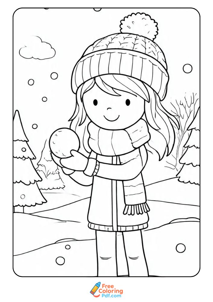 Color a cheerful girl holding a snowball, smiling against a snowy backdrop. This fun winter coloring page captures the joy and excitement that winter brings to everyone.